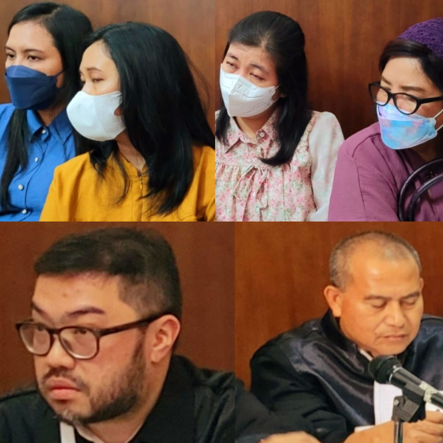 Foto : Para Terdakwa Dra. Ani Puspitaningsih, Dini Fatmawati, Ana Dwi Fitrisari,A.Md.PK, Nanda Dewi Harmani (atas), Ronald Talaway & paetner, penasehat hukum terdakwa (bawah), diruang Sari 3 PN.Surabaya, Senin (12/02/2024).