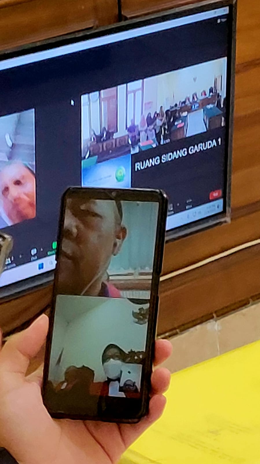 Terdakwa Didik Heru Purnomo, Bin Sunaryo, menjalani sidang agenda putusan hakim, diruang Garuda 1,PN.Surabaya, secara Vidio Call.