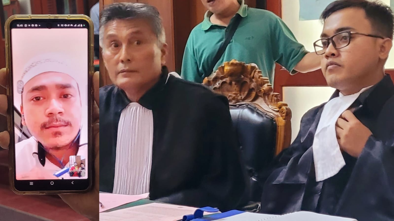 Foto : Terdakwa Tangkas Muga Budiarto, didampingi Penasehat Hukumnya Victor Sinaga dan Rekan, menjalani sidang di ruang Tirta PN.Surabaya, secara Vidio Call.
