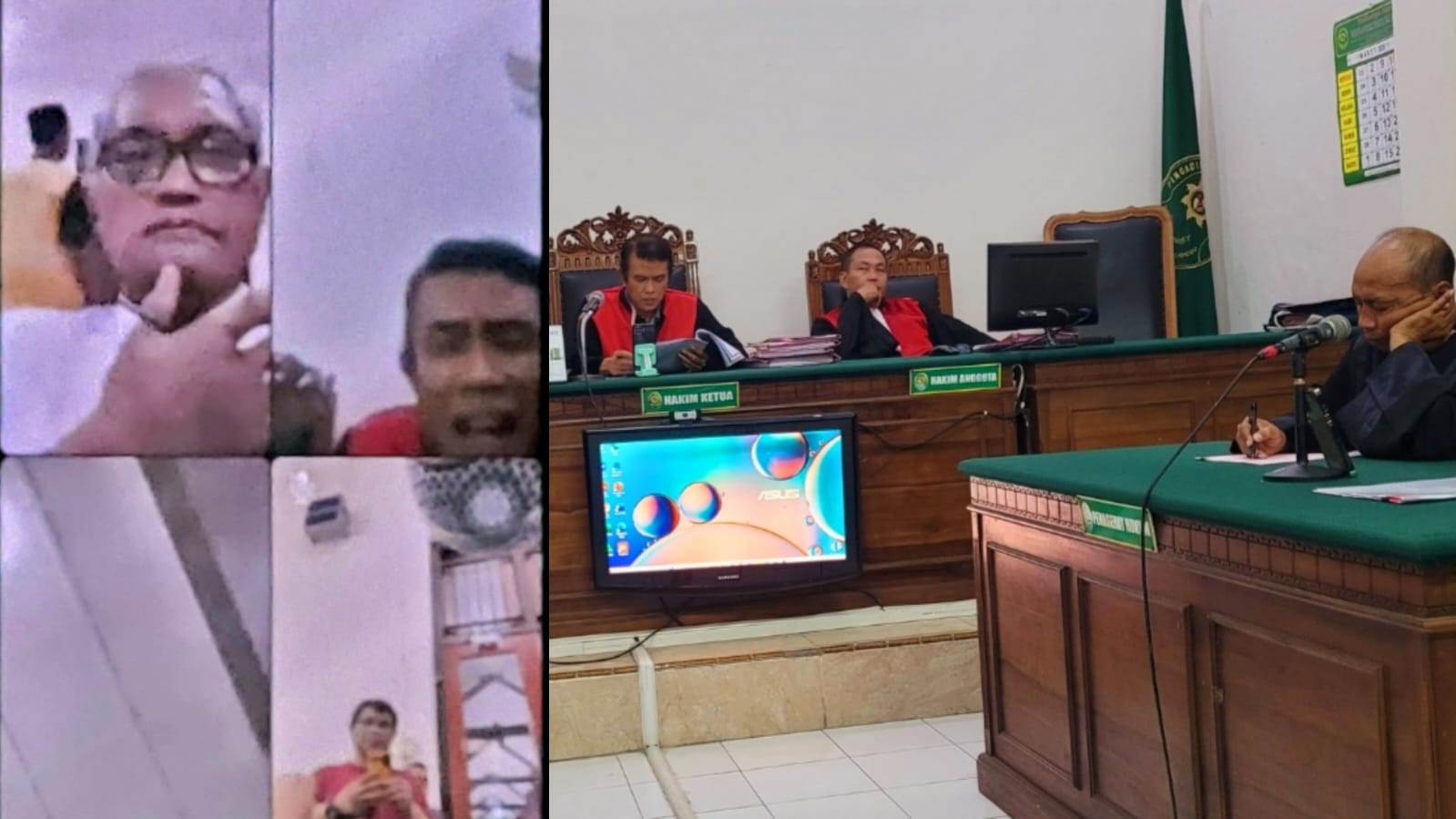 Foto : Terdakwa R.M. Permadi Koesoemopranoto (63) Warga Jalan Kejawan Putih Permata 1, Mulyorejo Surabaya (kiri atas), saat menjalani sidang agenda Tuntutan JPU, diruang Garuda 2 PN. Surabaya, secara Vidio Call.