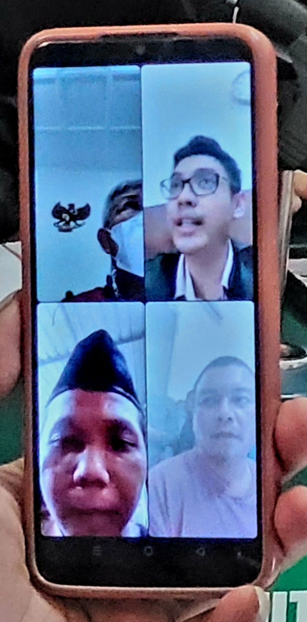 Dwi Siswanto bin Supriyono(29),(kiri bawah), saat menjalani sidang agenda dakwaan, saksi, pemeriksaan terdakwa diruang Sari 3 PN.Surabaya, secara Vidio Call, Kamis (11/01).