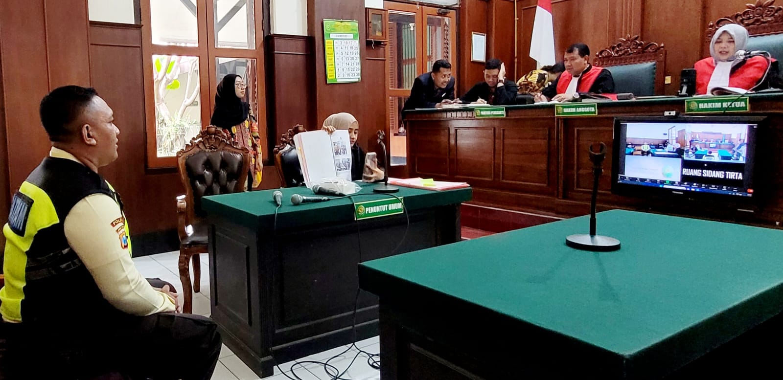 Surabaya– Sidang perkara pidana pencurian Handphone merk Oppo milik saksi Siti Yumaroh yang sedang di cas dieuang tunggu penumpang Stasiun Pasar Turi Surabaya, yang di embat oleh Terdakwa Edi Prayitno bin Wasidoh, diruang Tirta 1 PN.Surabaya, secara Vidio Call.