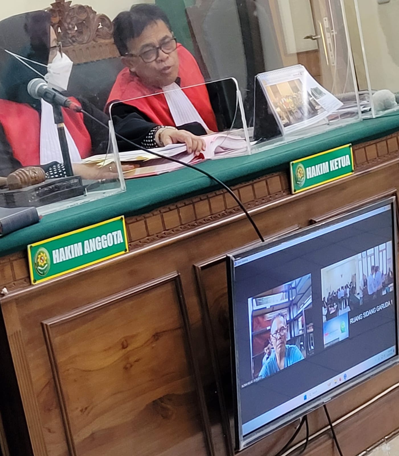 Terdakwa I Wayan Sukrayasa (54) Direktur PT. Bali Rekamandiri Kargo, menjalani sidang agenda putusan hakim, diruang Garuda 1 PN Surabaya, secara online.