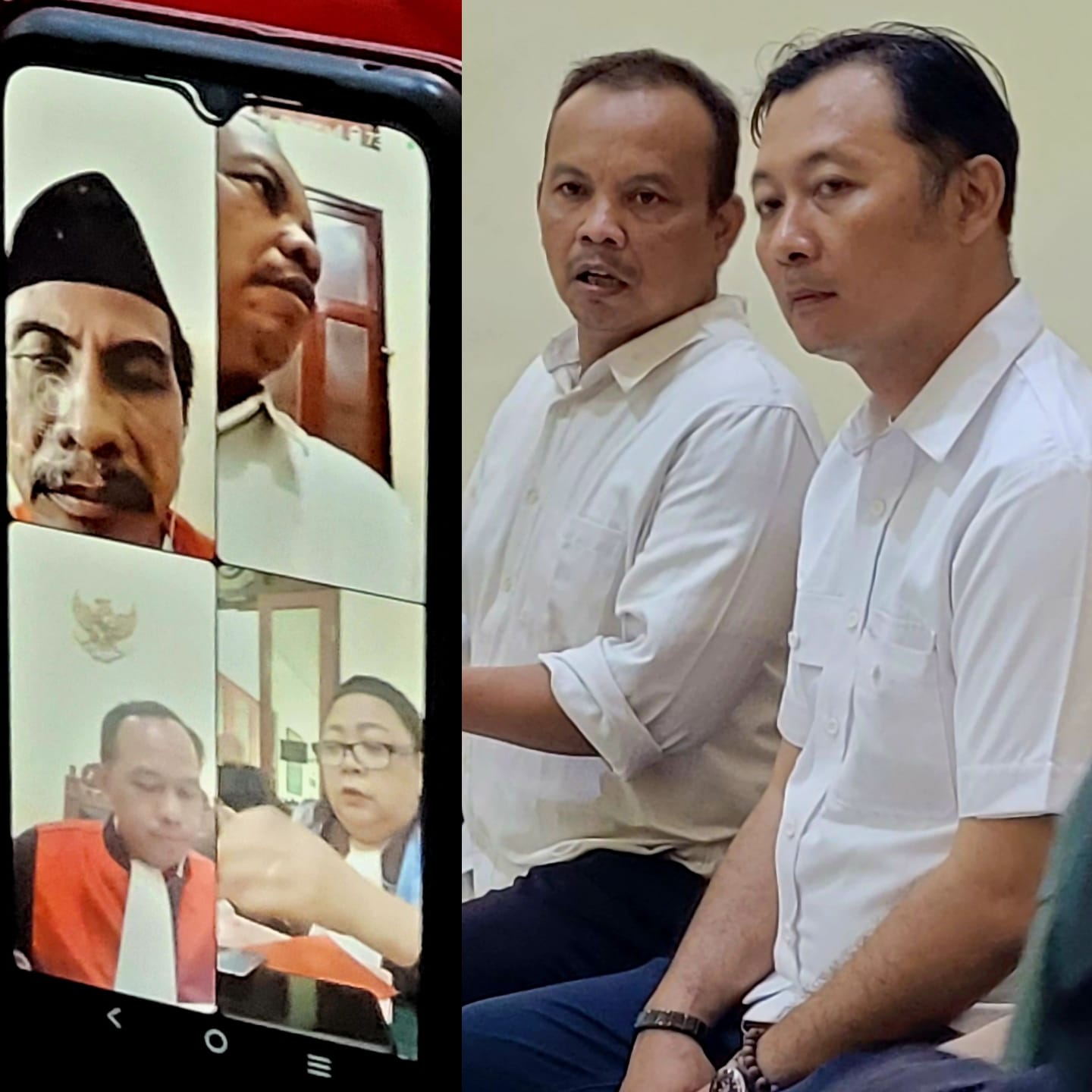 Foto : Terdakwa Sulianto alias Soto bin Said (51) (kiri), dan dua saksi penangkap anggota Polsek Wiyung, agenda sidang saksi, diruang Garuda 1 PN.Surabaya, secara Vidio Call, Senin (03/02/2025).