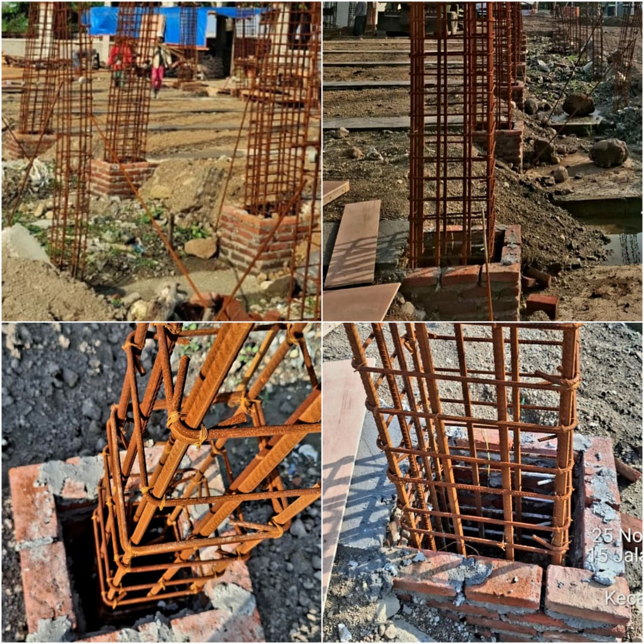 Sorotan utama muncul pada pekerjaan struktur kolom utama gedung di beberapa titik pondasi. Di lapangan terlihat rakitan pembesian kolom menggunakan besi ulir berdiameter besar, yang dicor dengan metode begesting tanam tanah dari pasangan batu bata, hingga mencapai ketinggian sekitar 50 cm di atas permukaan tanah. Setelah proses pengecoran, tampak sisa tulangan besi beton menjulang ke atas.