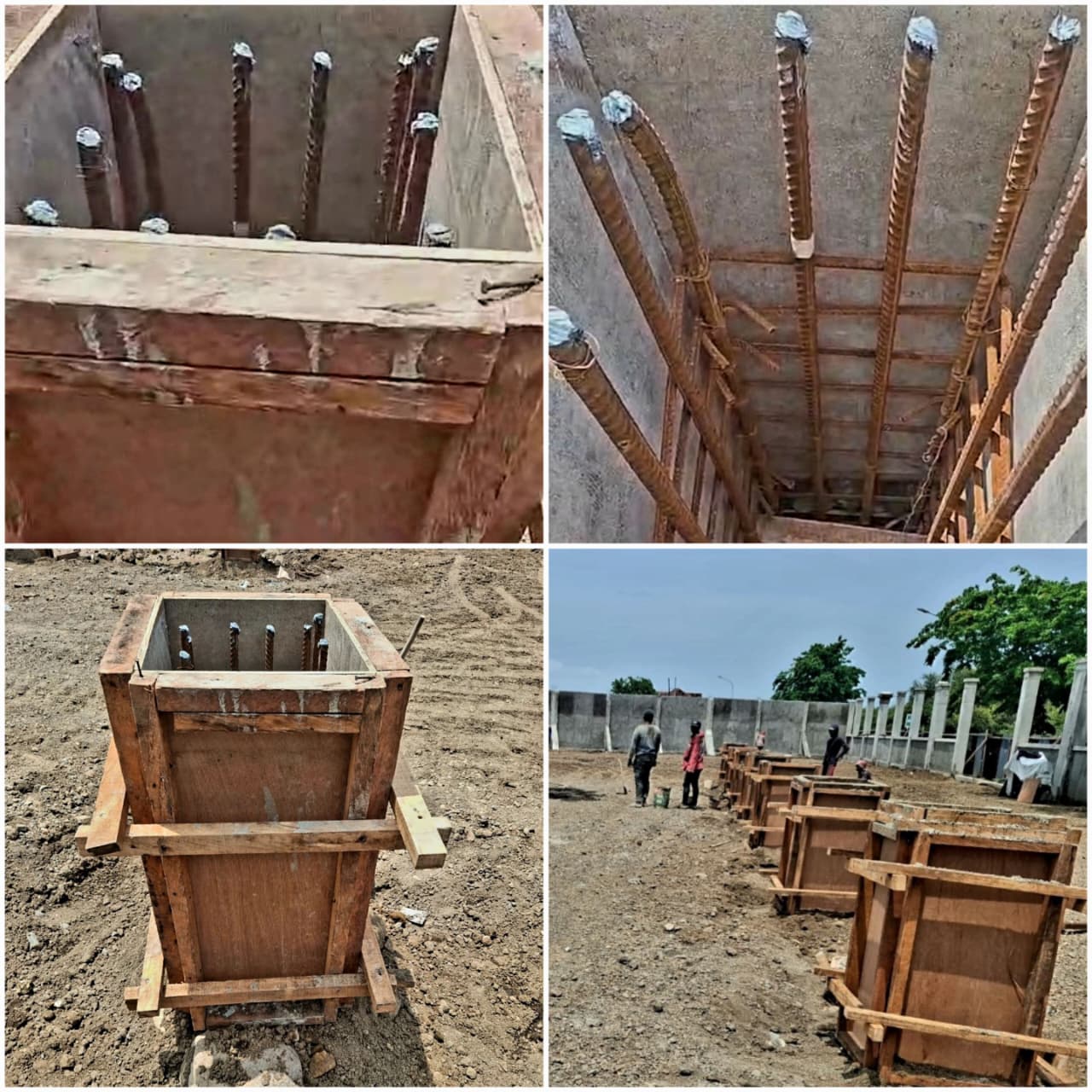 Pada pekerjaan kolom beton pagar, terlihat penggunaan penyangga beton bertulang dengan sudut kemiringan tertentu yang berfungsi menjaga kestabilan kolom agar tetap tegak selama proses pengecoran. Meski demikian, masih perlu dicermati lebih jauh apakah mutu beton yang digunakan telah sesuai spesifikasi, meliputi karakteristik kuat tekan beton, diameter dan jumlah tulangan, jarak sengkang (beugel), serta ketebalan selimut beton, sebagaimana tercantum dalam gambar kerja dan dokumen bestek.