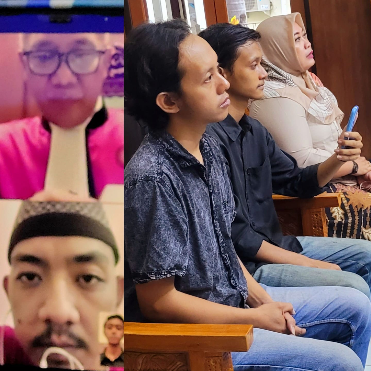Terdakwa M. Syahrur Romadhon (kiri bawah), dan tiga saksi saat dihadirkan JPU, Susi Rinawati, Irfan Affandi,Zendy Aditya, agenda sidang putusan hakim, diruang Tirta 1 PN.Surabaya, secara Vidio Call.